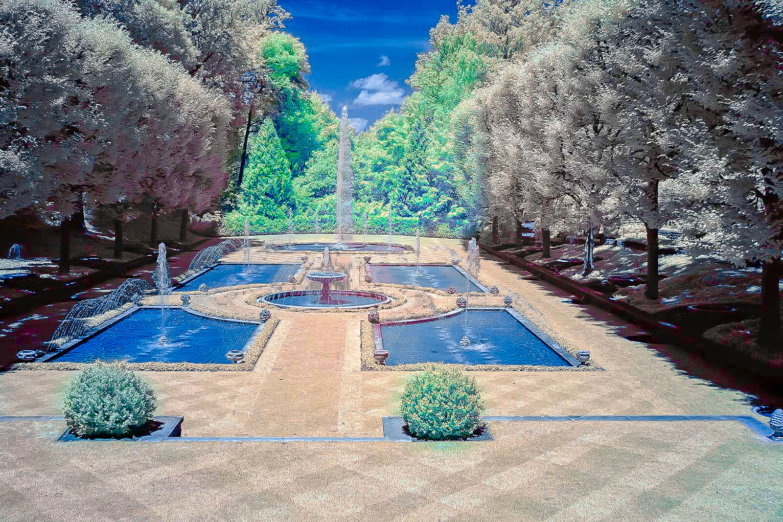 The science is that the chlorophyll in the leaves absorbs light in the red (long wavelength) and the blue (short wavelength) regions of the visible light spectrum. Green light is not absorbed but reflected, making the plant appear green. With an infrared filter, however, the visible light spectrum is not visible! Hence, vegetation appears white, rather than green.