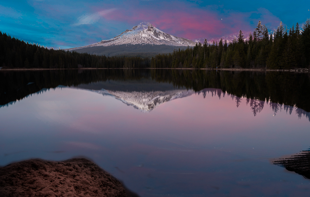From my experience, and I got the same result that you did, the image can be enhanced by a sky that adds to the feeling of tranquility. In the Visual Feedback (VF) I added a sky with color using On1 2018 Layers. In PS I quickly duplicated the sky, inverted it and added it at 35% opacity to the lake. It isn't perfect but should give you something to think about the next time you get up to Mt. Hood.