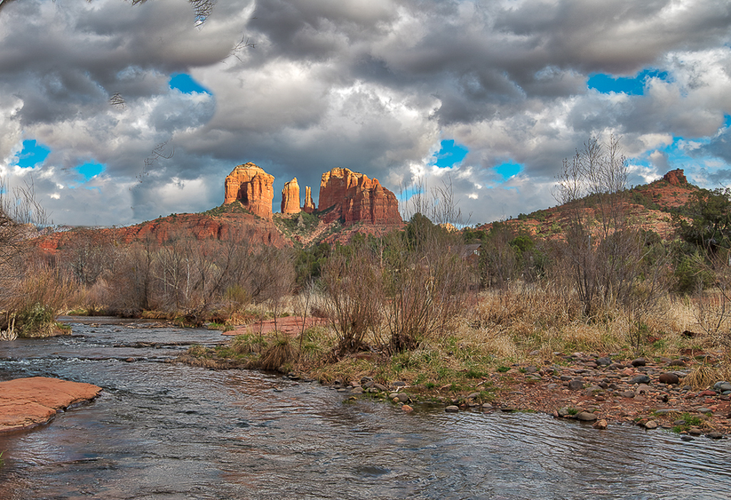 Scott, I believe that you have created great depth of field that captures the eye with a strong foreground, mid-ground and background. For me the reds on the rocks harmonize well with the greens and blue-grays of the foreground. I feel that the Cathedral Rock creates a fixation point that draws and hold the viewer's eye.