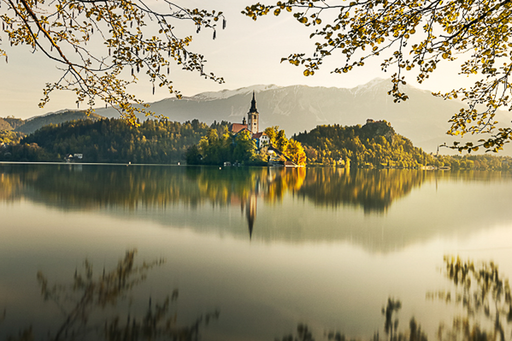 For me there are too many branches - original and reflection - and that is a distraction. I believe that these are nothing more than a frame for the church so I have cropped the image as shown in the VF to focus more on that church. |
