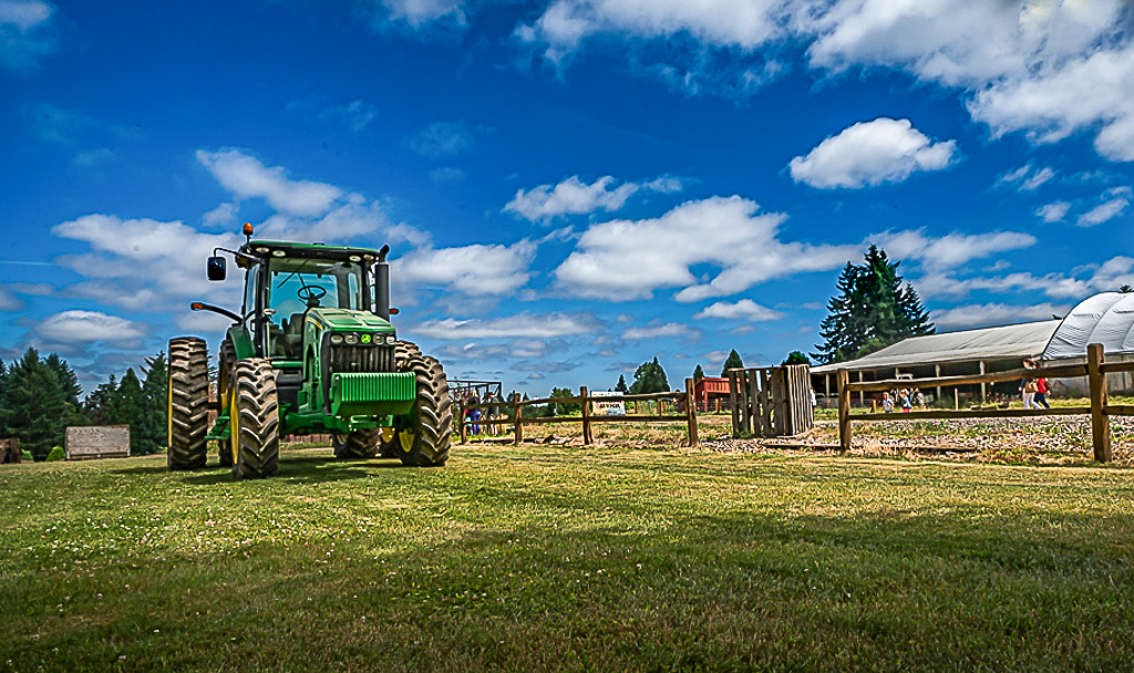 To my eye the image is a bit dark. I feel that the branches in the upper right and the pines on the right do not tie to the subject of the image and could possibly distract the viewer's eye. In the VF I have removed them. From my experience the tractor could be sharper so I have attempted to adjust that as well.