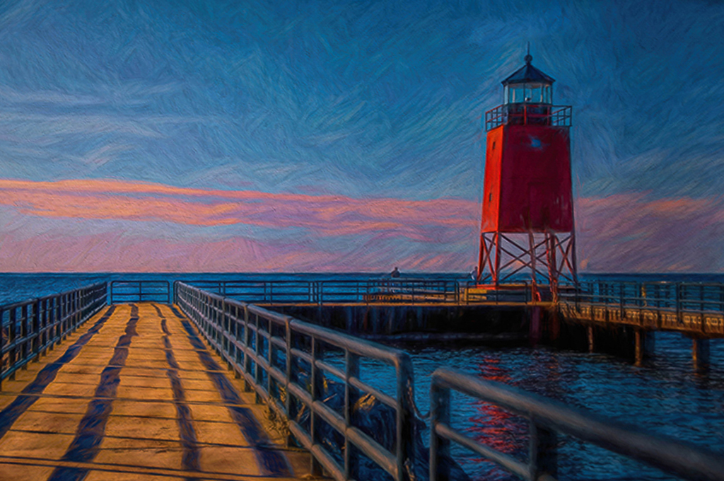 For me this image creates meaning and brings back stories from childhood. I feel that the visual distribution of the walkway and the lighthouse draw in the viewer's eye and hold it there without distraction. In my opinion the coloring is correct and the colors chosen work in harmony. I believe that the finishing you have added further enhances the image. Good job!