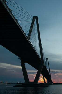 For me the sunset off to the right draws my eye from the great structure and sharpness of the bridge. So I have taken the liberty of refocusing my eye (at least) back to the bridge by moving the sunset under and going to a vertical image.