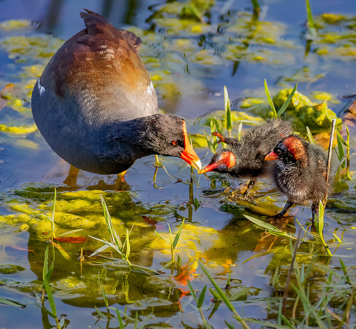 From my experience it seems that the beaks of the Gallinule are more red than they appear here. It leaves me wondering if the more orange appearance is an artifact of the bright sunlight. I feel that the chicks might stand out a bit more if the background were less brilliant. In the VF I put the image into On1 Photo Raw Effects and used a very quickly done luminosity filter to mask the birds and bring down the highlights. |