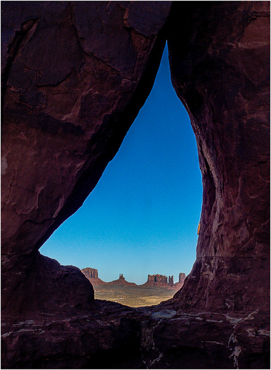 Erik, I like the image composition. I feel that th optical balance between the "natural vignette" of the slot canyon and the monuments in the background will truly [ull the viewers eye to the monuments and hold it there. I have done something a bit different. I brought out just a bit more detail in the canyon rocks, less I think than Isaac. Then I used "Clarity" and "Contrast" in On1 to bring out the monuments and ever so slightly decreased the exposure (-1/3 stop) of the sky. This is what I got. |