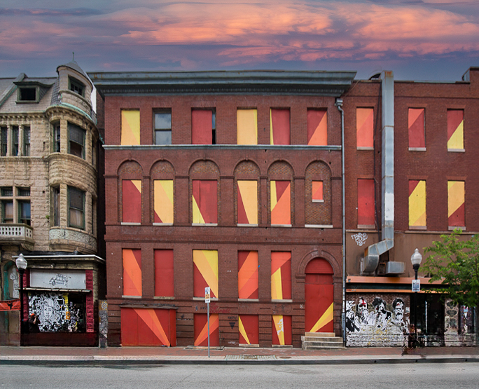Vella, to my eye I like the original image with the modifications, except the crop.crop. I believe that your post work has really brought out the windows. To me the entire image has more of a story. The ductwork, the two small shops both add for me to the "urban" story.
