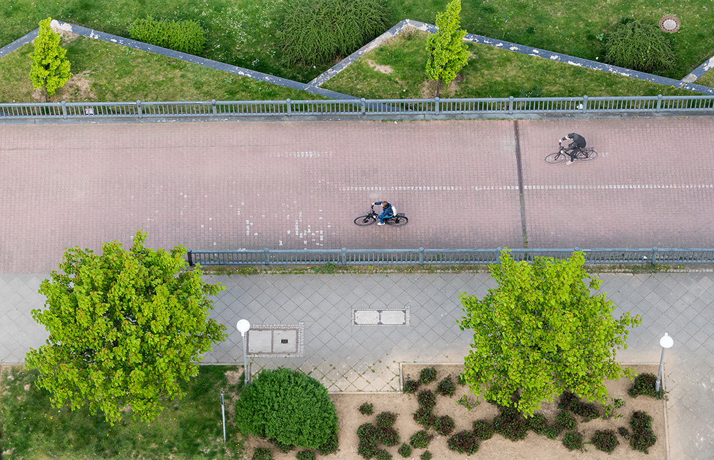 I like the angles and patterns in this. I agree with Dan about the position of the cyclist. I cut out the front cyclist and placed him above and behind the other and then cloned in the space where I had cut him out. |