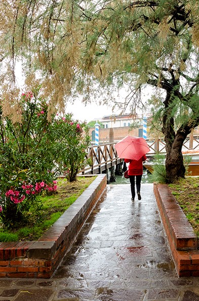 Your original stands out more to me than your cropped version. I think the color seems brighter, and with more reds that seem to be playing back and forth across the path and the lady. If you still think it needs cropping I would only crop a little from the top and from one side. Nicely done while being out in the rain yourself.
