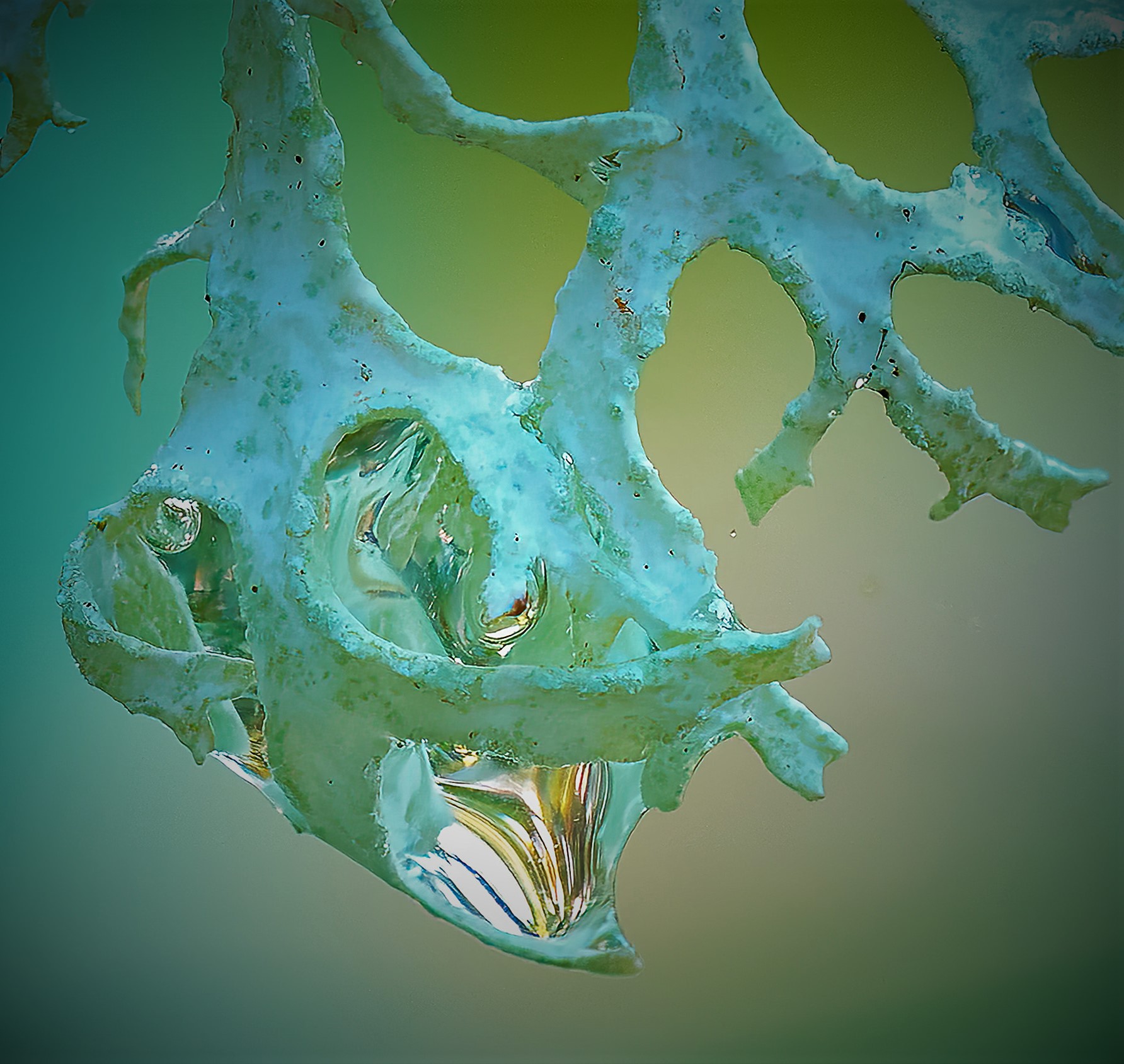 Dan its hard to believe this is lichen which in my mind is a good thing. I kept looking at it and looking at it. I love the colors and with the water drop inside it really sparks my curiosity. Charles did a great crop but I played with my version a little to darken it as if it was more in the woods. Great find to photograph for sure. I look forward to the next several months. |