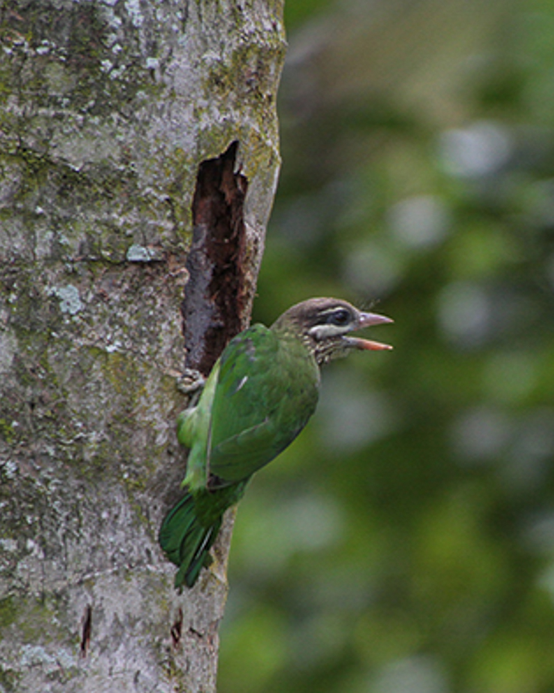 An amazing capture of your barbet at work. Beautiful bird. Great pose. So sharp I can see hairs above his beak. Levels and saturation are good.