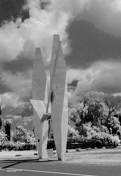 Nathan - Post processing of IR in color is not always easy and you've almost succeeded!! The piece of 'art' is a bonus. The artifact in the sky areas is bit of a worry.