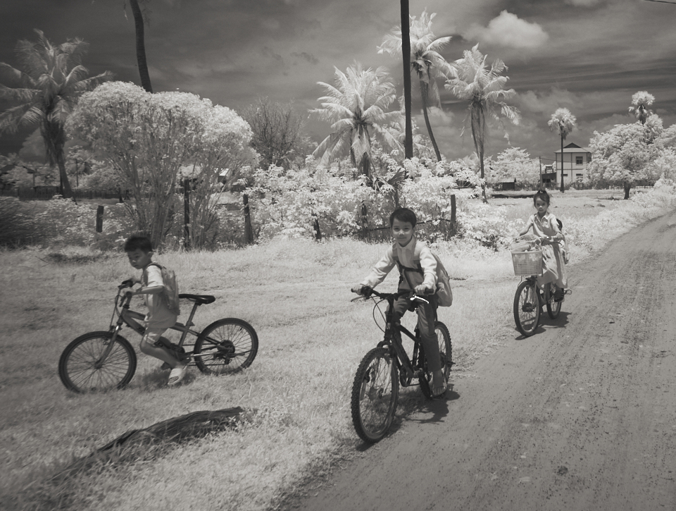 A well-considered subject for IR. Great composition too! Having said that, I was double minded about the kid on the left and wondered if the image would look better without him!! Or, how about an alternative composition? And yes, both the tree trunks should go. |