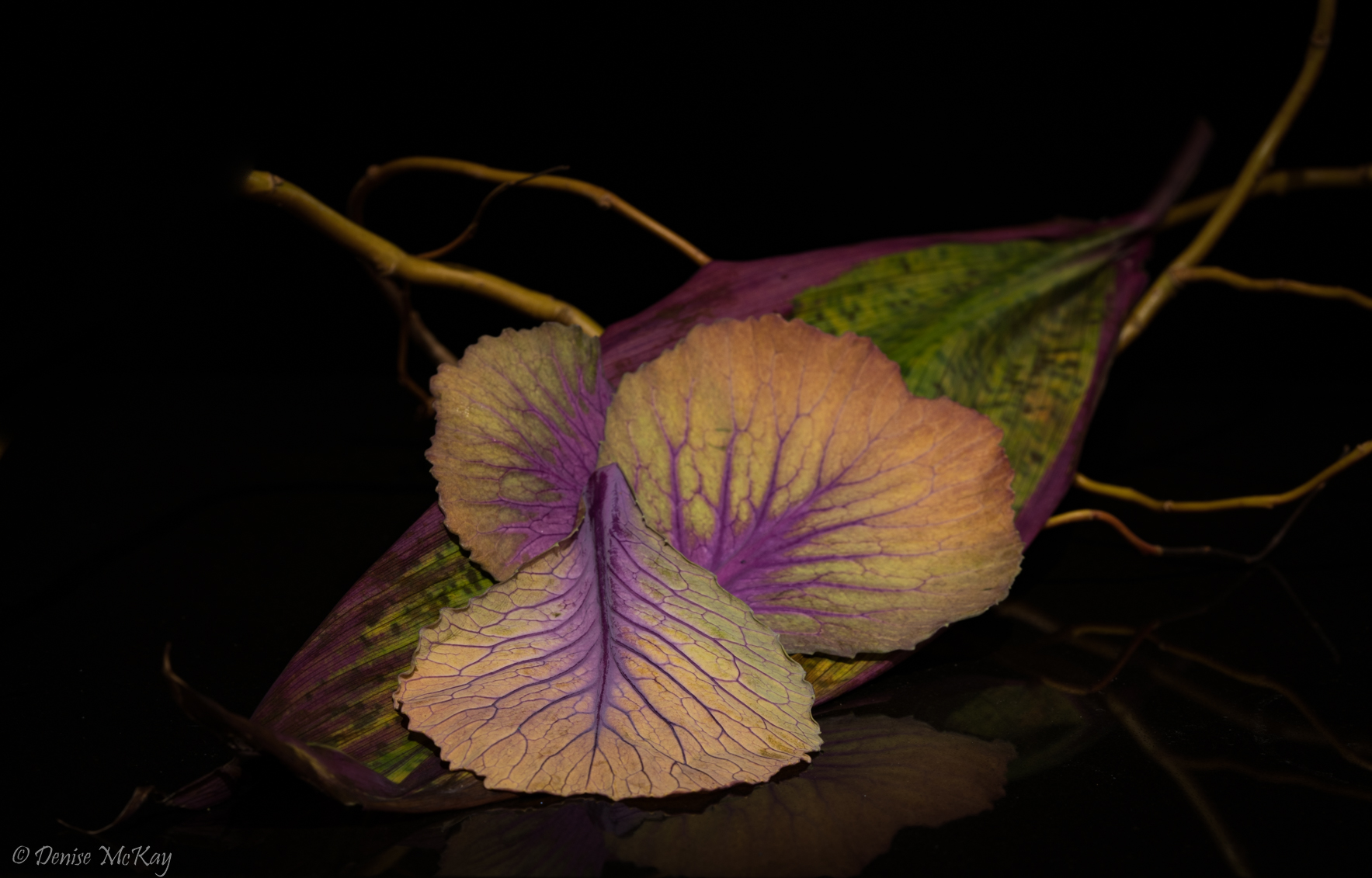 Thank you Bill! The lines at the top were woody stems that I laid underneath the large leaf to hold the petals up at an angle. I felt like they would serve as another leading line to bring the eye through the photo. I shot a wider photo that shows more of the stems and I was unsure of if it would come across as a macro or more of a still life. Here it is for context. Sorry for the distracting copyright! I forgot I had done that on this shot. |