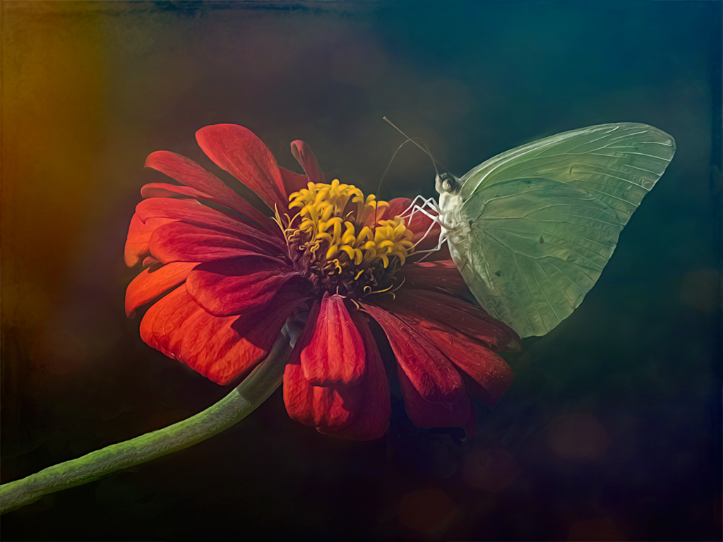 For the theme of "fine art" VS documentary photography, I took the liberty of playing with this image in Topaz Studio 2. I added a "look" made up of multiple filters that I didn't think needed adjusting (Dreamy Day). However I did add one more filter, Smudge, so I could manipulate the lines a bit. I used Normal blending mode at 50% opacity. This version emphasizes the bright light coming from the left and hitting the front of your butterfly. I feel like the color tones of the background compliment both the flower and butterfly. So I hope you don't mind me playing to create another quick version as food for thought. :) |