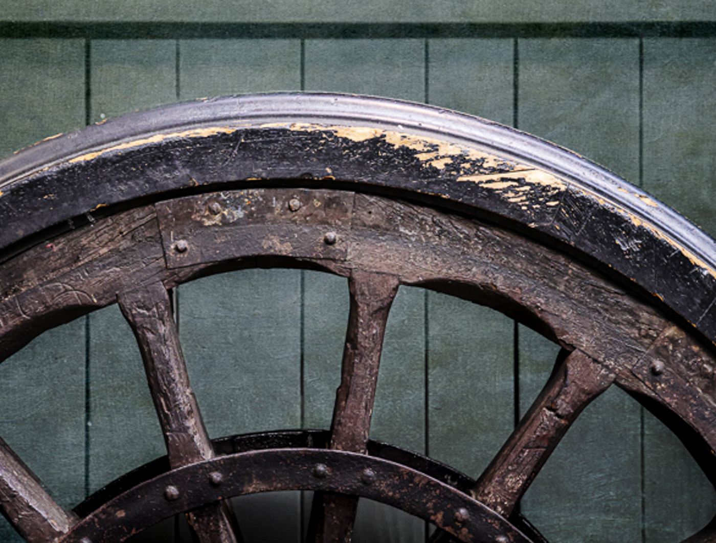 On the flip side, you could go for a much closer crop and really focus on the age and textures of this old wheel. Maybe that would emphasize the story of a wheel that's done it's time and is from a past age. I've attached an example crop that changes the point of view on this image a bit and may be a jumping off point for further ideas. |