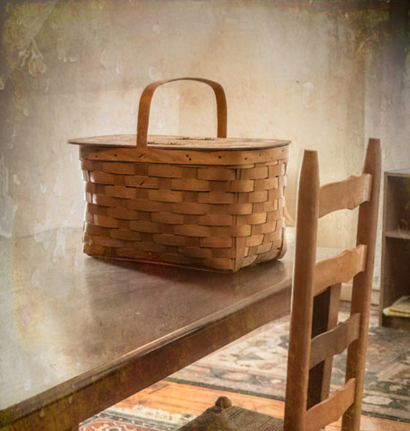 I was curious if doing a different crop would improve this image in any way. Since you liked the room, but also were focused on the basket, I cropped in on the basket and added some more texture and contrast to only the basket, and darkened the shadow on the table a bit. I tried to leave the sense of an old room by ensuring the rush seat of the chair and old carpets could still be seen, but emphasized the basket. I've attached the example as just food for thought.