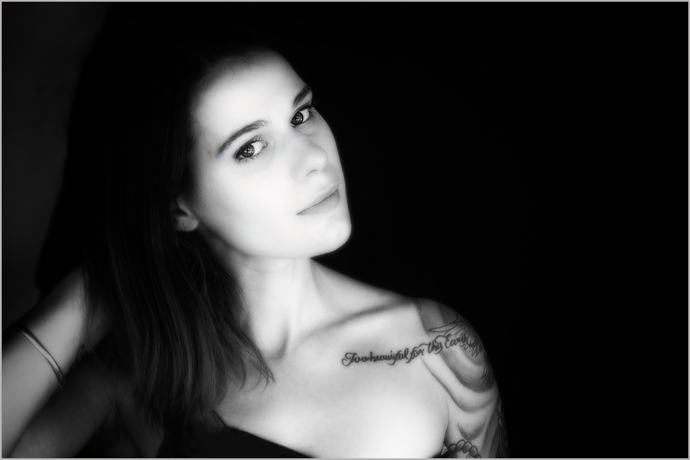 Mary, I love what you've done with this portrait. The way the light is falling across her face and body really sets her off against the stark black background. I like the inclusion of her arm on the final image, as I feel it supports the tilt of her head well. I don't think it makes her look off balance. I also like the ethereal softness, but suggest maybe slightly reducing the highlights as her cheek might be a little blown out and also cropping in a little more from the right.