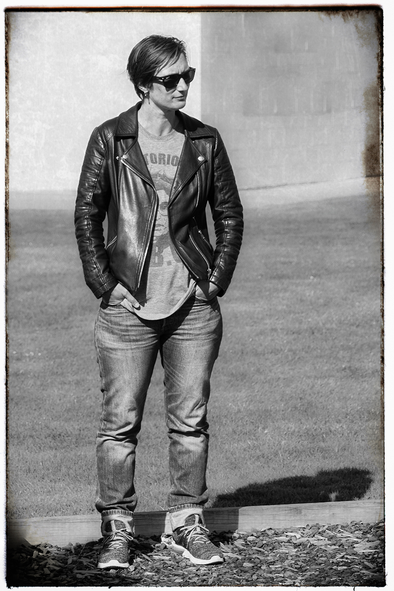 I took a stab at doing something a little different as an example as well. Katie's pose and outfit remind me of an old 1950's portrait of a "rebel". Cuffed jeans, leather jacket, sunglasses, and kind of an edgy pose. So I took your original into Lightroom to remove the items on the back right wall, then moved it into Nik Analog Efex to add a black and white film effect. I added a textured film type and frame around the edges, playing with the opacity and strength of the effects I chose. So I went darker and more gritty rather than lighter, LOL, but thought it might be interesting to see. |
