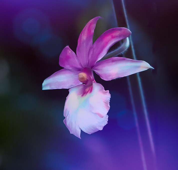 I then tried to add some drama in a different way, as you indicated you wanted to do that. After the Lightroom edits I took the photo into Topaz Studio 2 and added a "colorful" look. This applied textures to the background and enhanced the original colors of the flower and added some additional, complimentary color tones. I've added it here as just another example of how one could emphasize this beautiful orchid in a dramatic way. |