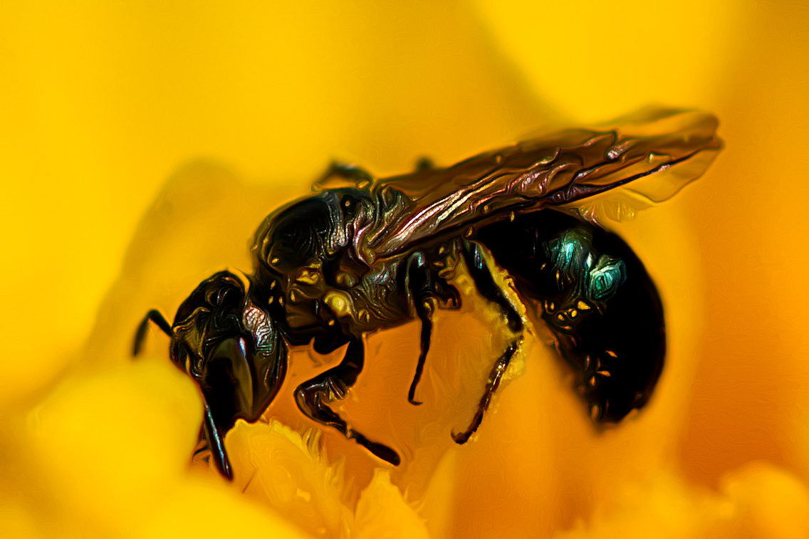 I like the strong contrast between the dark insect (I think it's a wasp rather than a bee) and the bright yellow flower. You can see just a small portion of the delicate and beautiful details of the wings. A different perspective, probably a little more above it, may have shown us more of those details. I also like how some of the highlights began to expose other textures on the body, but felt they were somewhat harsh and a bit too bright. I took the image into Lightroom to see if there was a way to enhance some of the interesting details you captured, but my efforts didn't work well. Instead, I went into Topaz Studio 2 to take the image in a completely different direction.