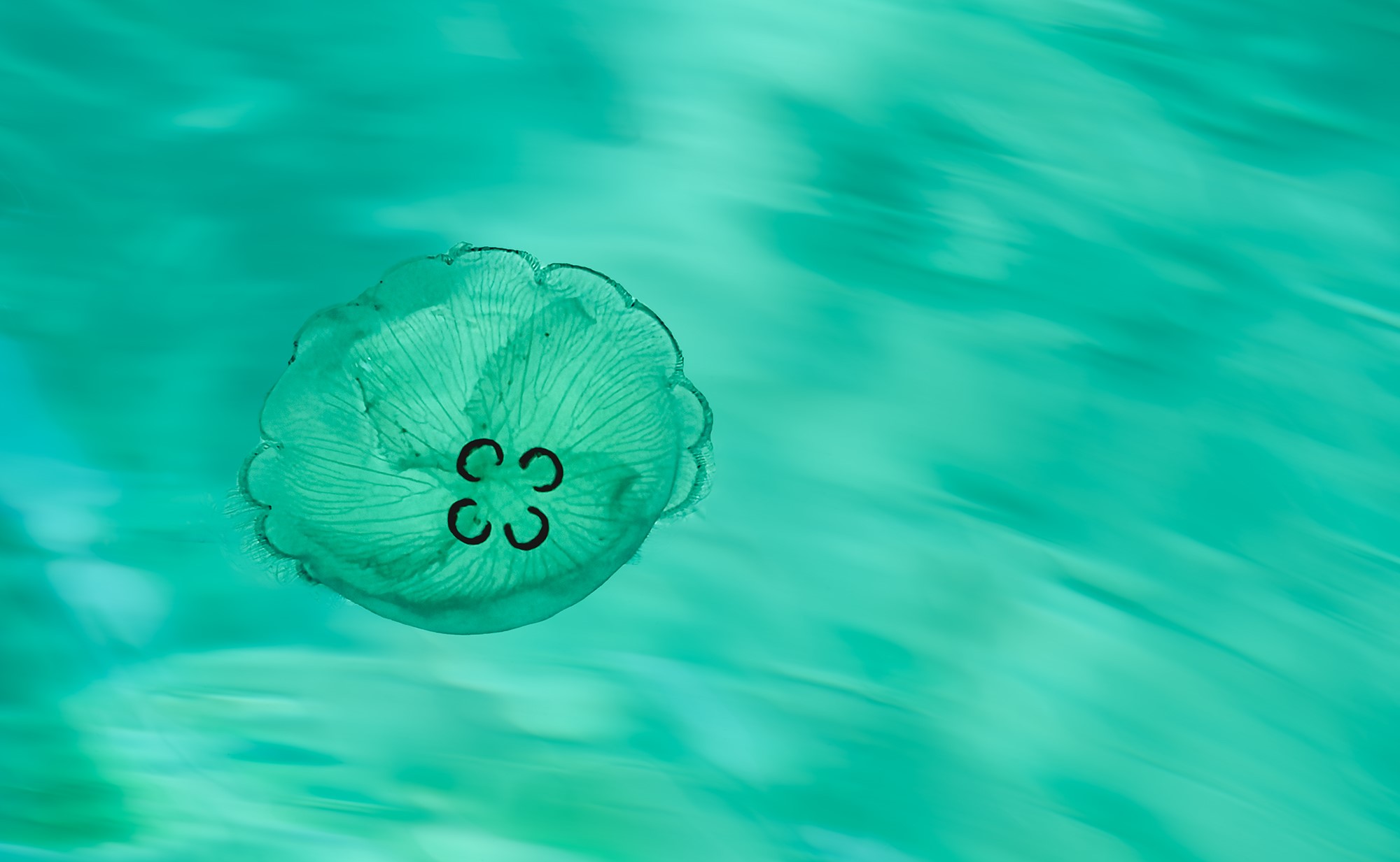 I wondered if doing a narrower crop would bring the jellyfish closer but also add to the sense of motion. Like it's moving from a father distance on the right to the left side. I've attached an example just as food for thought. |