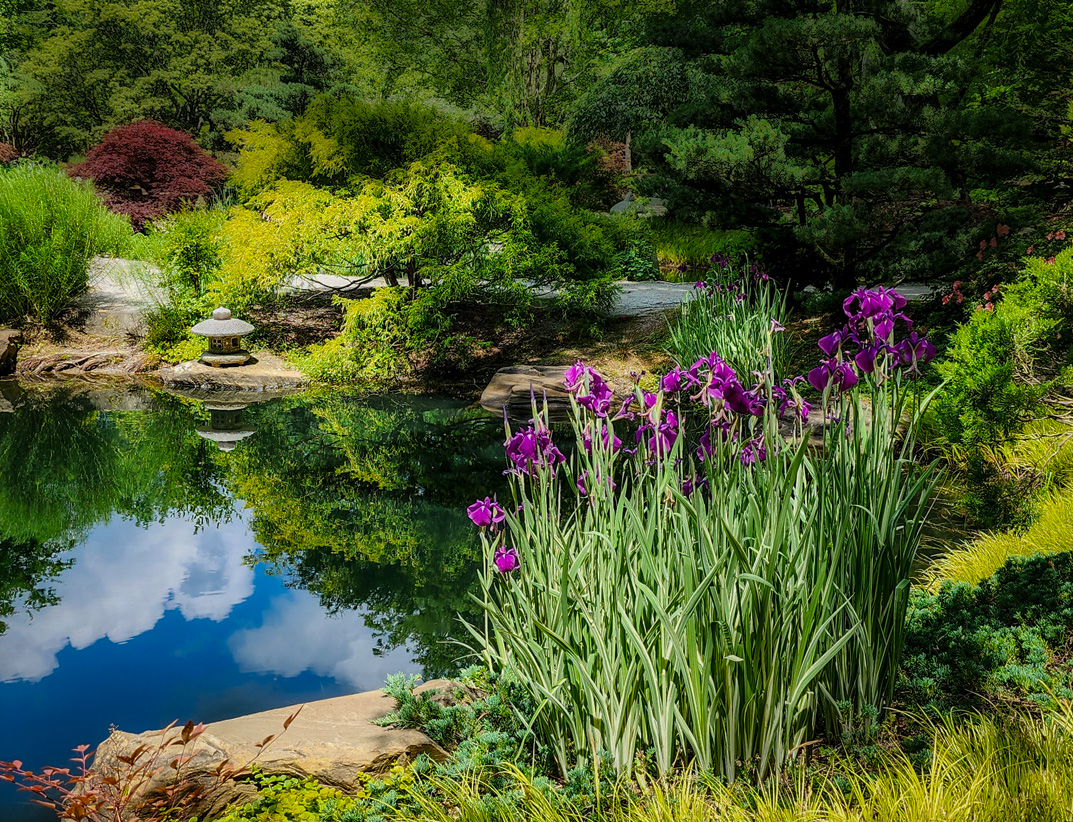 This is a really nice composition Georgianne, and beautiful subject matter. I love the cloud reflections in the water and how the scene has some shadow on the right side of the path, moving into sunlight. I feel softening the background is a good choice to add depth, however to my eye it now looks almost hazy compared to the original. Maybe it's just my old eyes, LOL. The small stone lantern seems a little blown out as well and maybe a highlight reduction would help there.