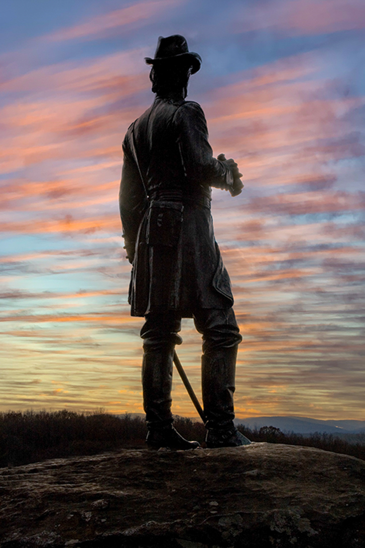 It almost appears that a live person is here rather than a statue. To add to a bit more "live" illusion, I cloned in some of the dirt over the little bit of platform under his left foot to try and add some more realism to this being a person. I also opened up the shadows just a bit, to show a little more detail in his uniform. Just a fun play with this image.