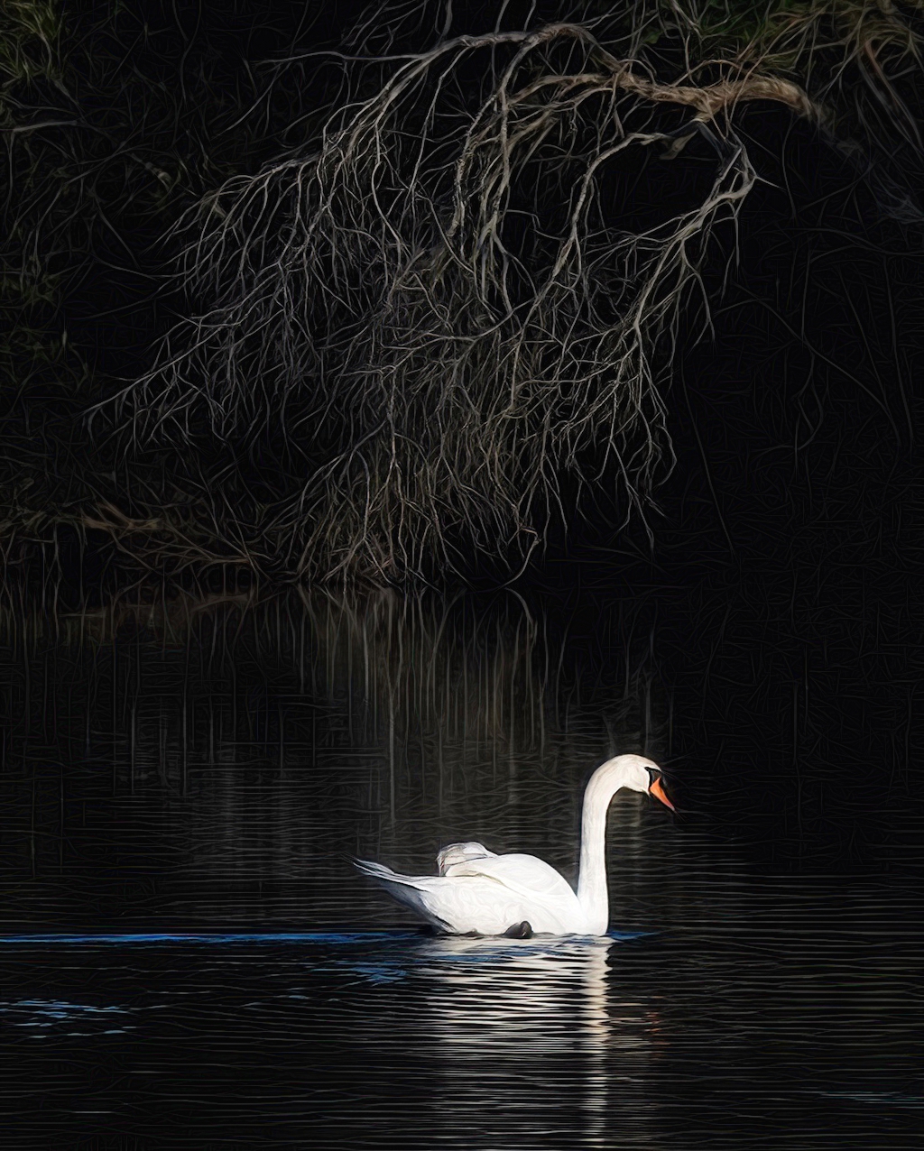 Rita, this is a much nicer image than your prior submission. I love the light you captured on those tree branches right as the swan was swimming past them. I think Jan's suggested crop improves the focus on the swan without losing the wonderful branches.