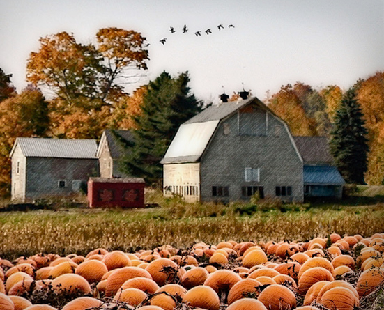 There was also something about the perspective of the pumpkins in the foreground that was nagging at me. You're looking at the farmhouse at a side angle, but I felt like the pumpkins weren't quite the same perspective. So I took your final into Lightroom and used the Transform controls to change the aspect ratio a bit and tilt it a little horizontally. This meant I needed to crop it after the adjustments, which makes it a bit tight on the left, but it took away that nagging feeling I had, LOL. Not sure if you can tell the difference as the changes were subtle.