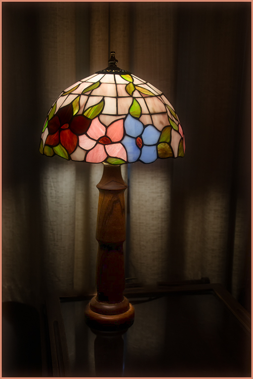 In Lightroom I used a mask on the lamp base to open up the shadows more and increase the exposure a bit. I like the moodiness of the deep shadows, so didn't want to brighten the whole image. I also removed what might have been a small horizontal light streak or reflection on the left where the curtains were at the top edge of the table. It caught my eye.