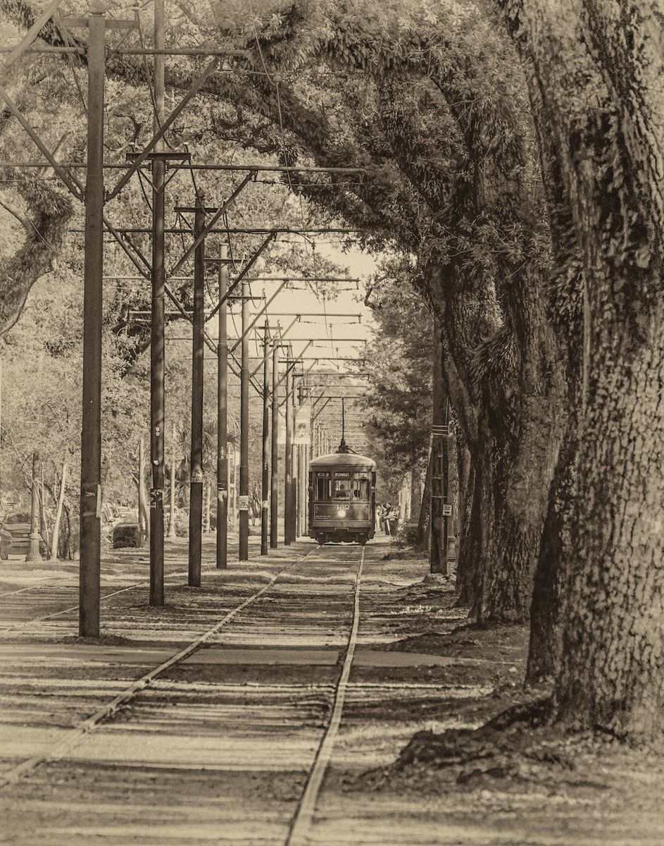 You've framed the trolly beautifully with the trees and the tall power poles on opposite sides. I like the fact that the people are somewhat in the distance and not overly distracting from the scene. The lighter tones do make this feel "antique". But to your question of going darker, I added a mask just on the tracks and darkened them a little, then added a slight, dark vignette to the edges. I've attached that image for your comparison. Don't know that it's better, but thought I'd add it. |