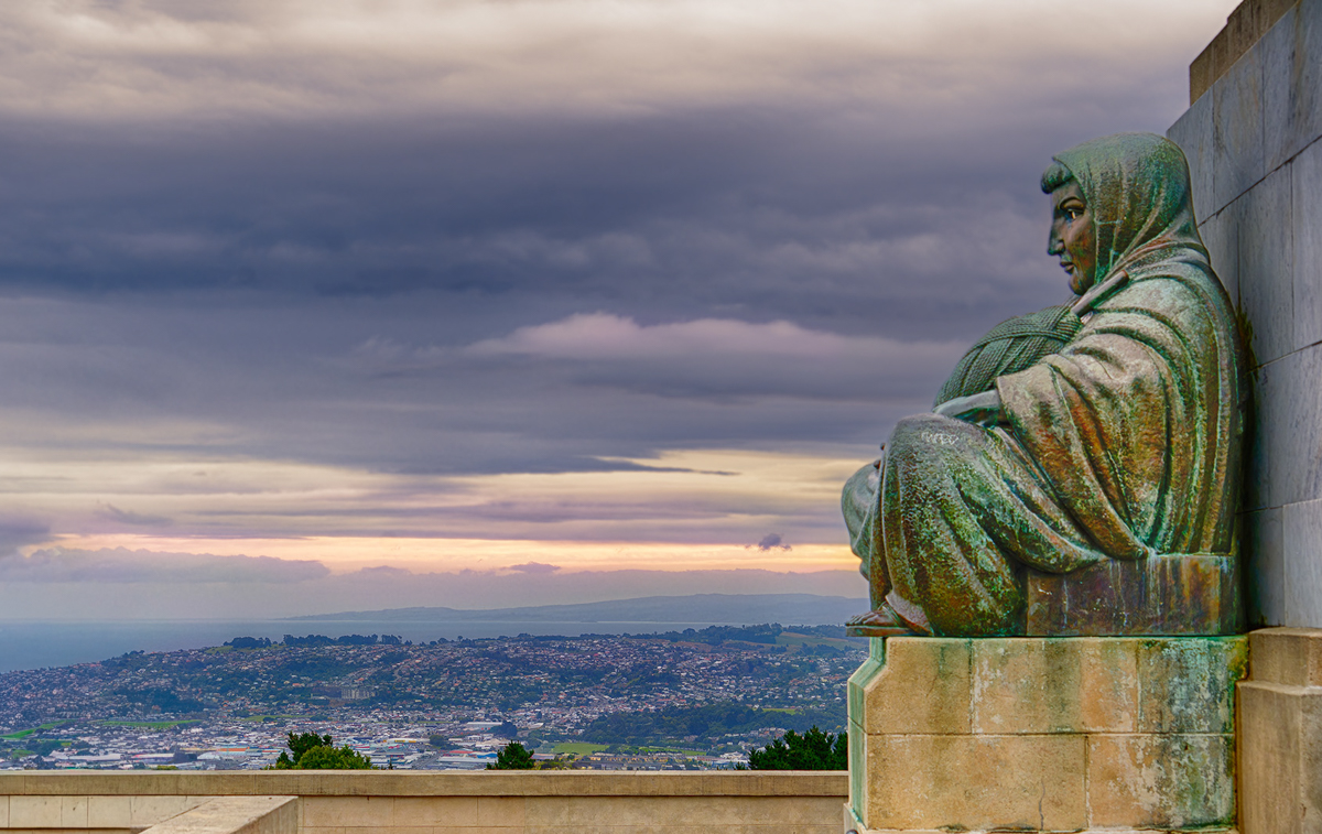 I prefer the color version Mary. The tones and patina are really beautiful. I agree with Jan that the stair railings don't add anything, so I tried a crop to take them out and also a slight crop from the left. I then removed the remaining tree branches and people using Lightroom Classic's generative remove. I wondered if it would still give the feeling of this woman peacefully reviewing the landscape. I liked having room for her to look into, so hoped the crop wasn't too extreme. |