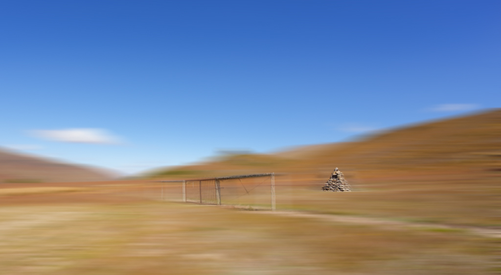 For some reason I didn't know where I was supposed to focus my eyes. I felt like there was too much landscape in the image. Even though the fence was close to the center, it didn't feel right that the fence was the point of focus. So using the rule of thirds I cropped the image on top and bottom, then from the sides I placed the left edge of the fence on the cross-hairs of the left bottom third and the cairn on the right bottom third. To me, it balanced out the composition without losing that feeling of rushing by.