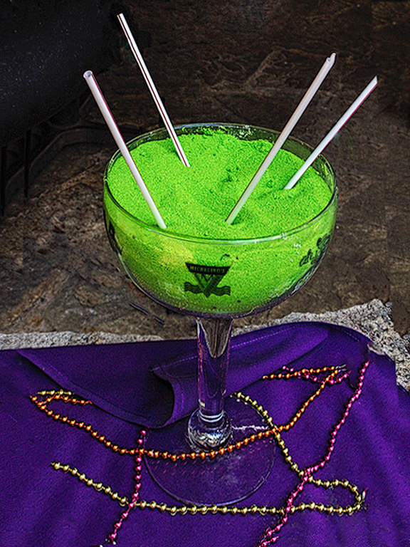 I have made some changes in the image for your to consider using primarily photoshop. I agree with Barbara that the glass should be straightened so I did that with free transform. Then I cloned out the medallions and the beads going to the left and right but allowed the beads to go out of the frame on the bottom to give moor height to the subject. I then did some dodging and burning to the purple cloth to give a sense of 3 dimensionality, I burned the front edge of the glass and the logo on the front of the glass. Next I removed all the sand particles on the purple cloth with the spot healing brush and lastly I did a content aware fill of the straw that was going out of the frame.