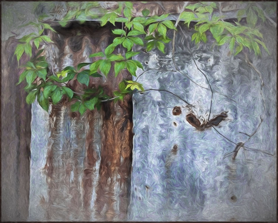 Barbara, love the contrast between the fresh green vine and the dingy background. This looked like a painting, so I played with Topaz Impressions. I wanted to emphasize the 'grunge' look of the background. Maybe I should have masked the leaves to keep them natural-looking. |