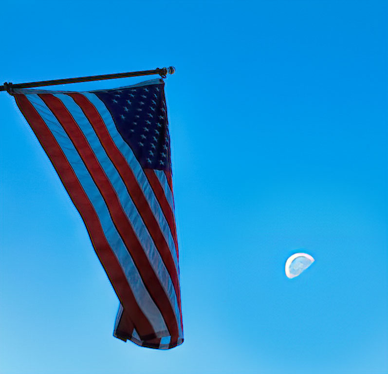 The idea is good, but the moon does need to be bigger and the flag clearer. Take one shot exactly like the original, but focused and exposed for the flag. Take another shot exposed and focused for the moon (you could zoom in on it; the blue sky may be darker or lighter, but will have the same hue.) I did this example using AI Gigapixel to enlarge the moon. Copied the larger moon over the small moon. Used Viveza to brighten the flag. |
