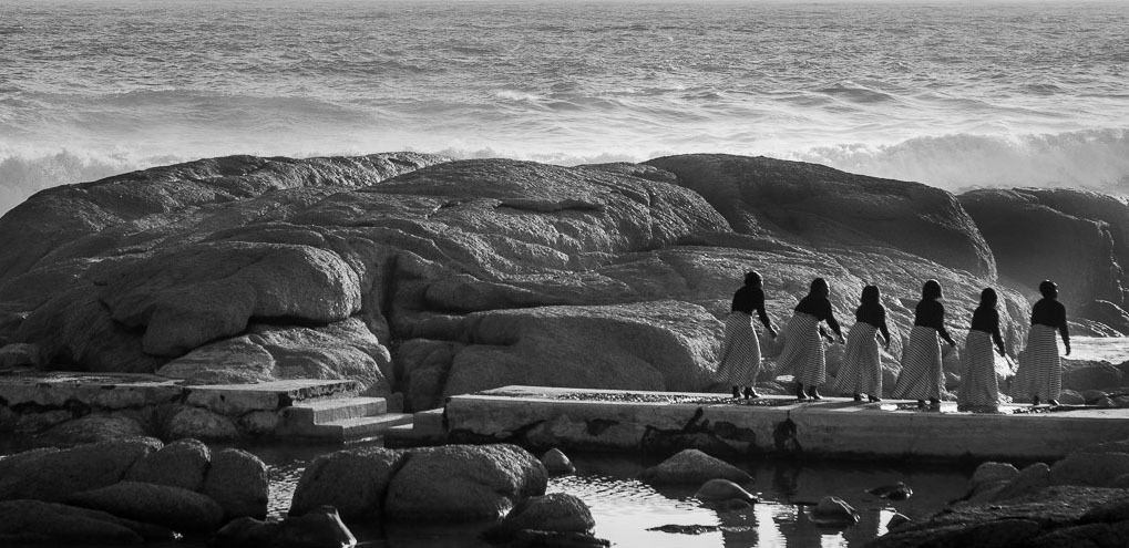 B&W needs a true black and a true white somewhere in the image. Increasing the contrast will be a big help here. It will bring out texture in the waves. Cropping the sky will make the women a larger proportion of the image and remove the distracting brightness of the sky. I cropped out the sky, increased contrast for the water, masked out the contrast from the rest of the image. and added a vignette to bring the viewers' eyes to the women. |