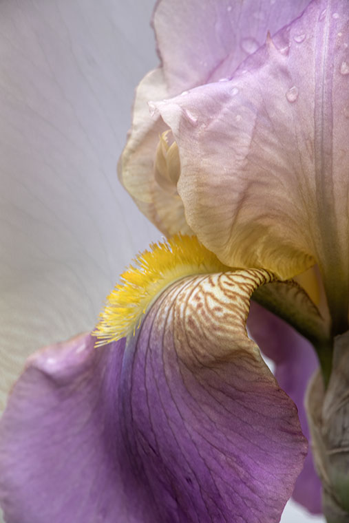 Thank you all for your excellent advice. The iris will come back next spring, so I can try your suggestions. Meanwhile here is a rough draft of a new background. Following Witta's suggestion to use the flower itself as a back ground - copied the whole layer, rotated it 180 degrees, lowered the opacity to 20%, and used a mask to bring back the original flower. |