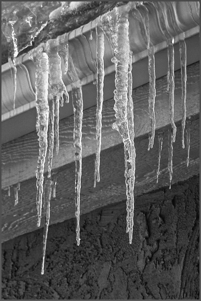 Ah, yes. We must always remember that the camera sees, we perceive. We also have selective vision. Actually this is quite a good picture of icicles. They really are difficult to photograph. The diagonal lines of the siding compliment the verticals of the icicles. The siding also gives some scale to the image. The soft tones are pleasing, belying the actual danger of standing under them. Ally, you made me curious about B&W. What do you think? |