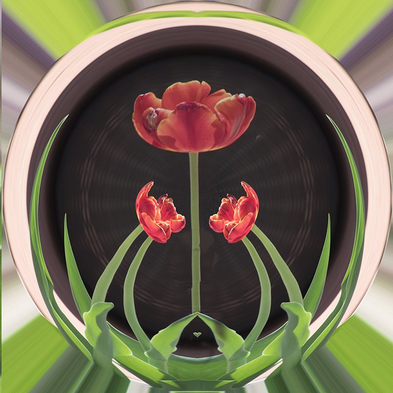 Yes, a stem for the sunflower might be good. Here is another swirly image. In this case the background and the single tulip came from the same original. There seems to be no end to the combinations and permutations of this technique. |