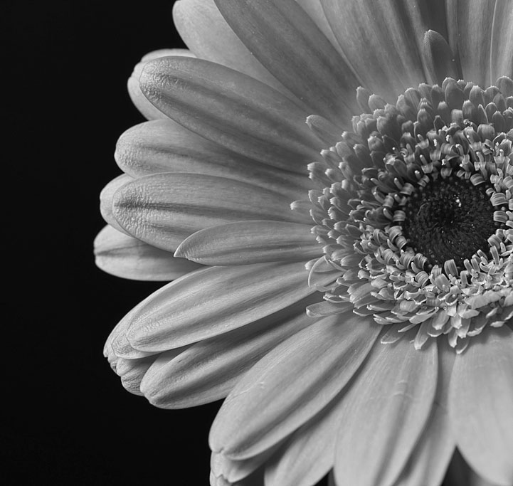 I have a gerbera daisy very similar to this. It got many the same comments that yours did. But we still like them, don't we? Black and white is counter-intuitive for flowers, but texture makes them ideal for monochrome. That said, my preference would be for a little softness on the petals, preserving the beautiful texture of the center. As for borders, they are dependent upon the final use of the image. For websites like this they can separate the image from the background. For prints or canvas wraps you probably don't want a border. A border on this picture would just let us know how you cropped it. |
