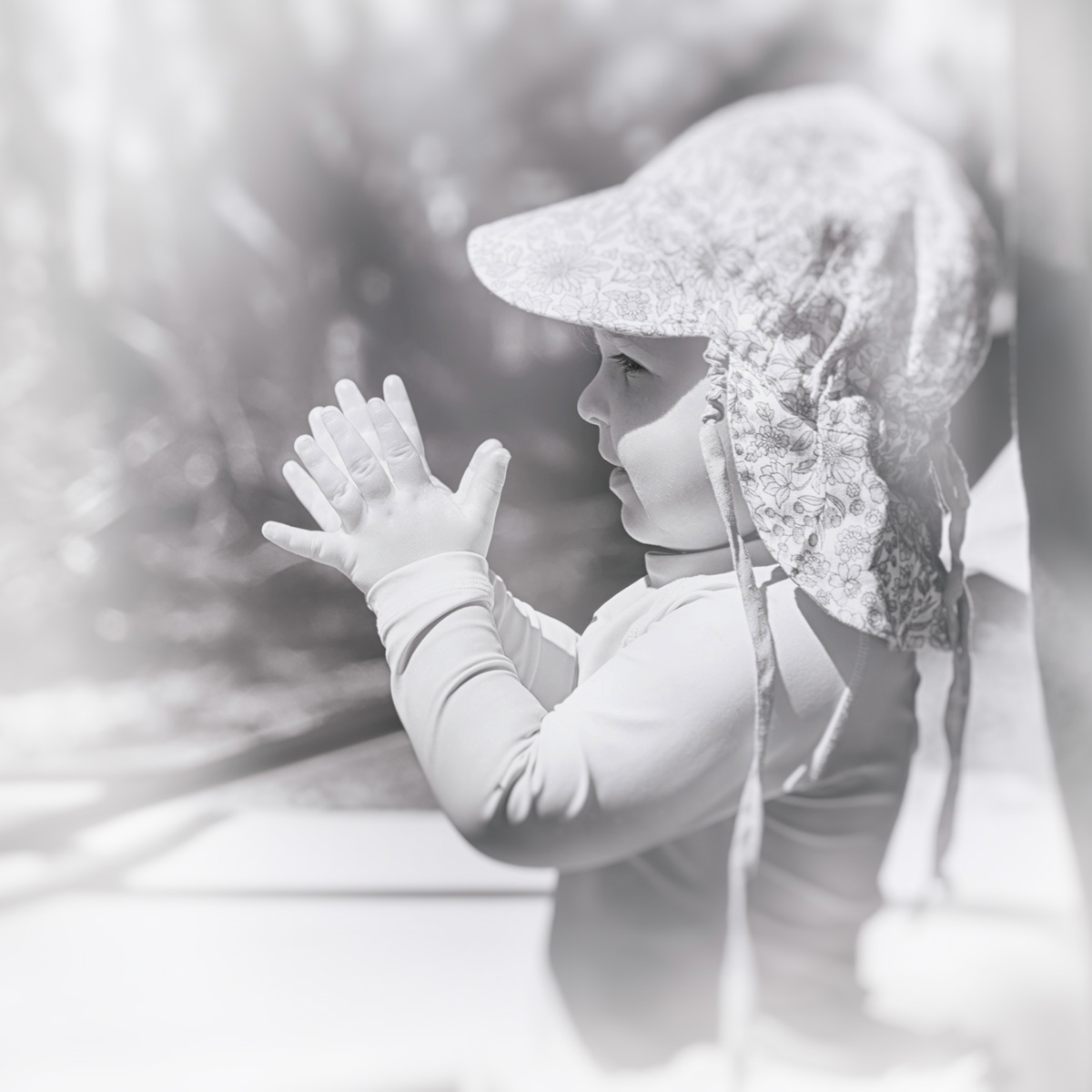 Yes, I like the square crop also. You did a good job brightening up the face under the hat brim. But somehow, this doesn't seem to me to be high key so much as overexposed. Perhaps it's the background. I put a white vignette to focus attention more on the face. Even in high key there should be an almost-black somewhere, so I used NIK Viveza on just the eye. Perhaps I over did it. In any case, she is a beautiful child. You should frame this for her parents. |