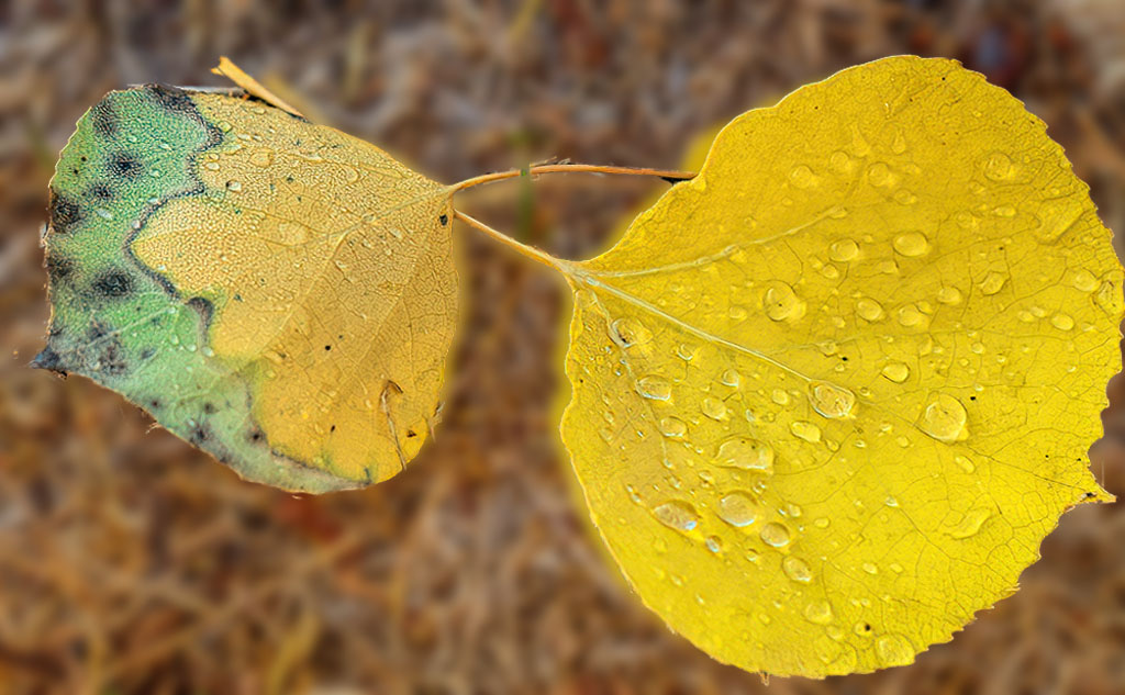 Aspen leaves are indeed beautiful in their simplicity. The green edge on the left leaf adds much interest. As far as using selective focus to blur the background - that would be difficult here because the leaves and the background are almost on the same plane. I would like to see more detail and depth (deeper color, more contrast) in the leaves. Just for fun, I tried blurring the background. Didn't do a great job, though. |