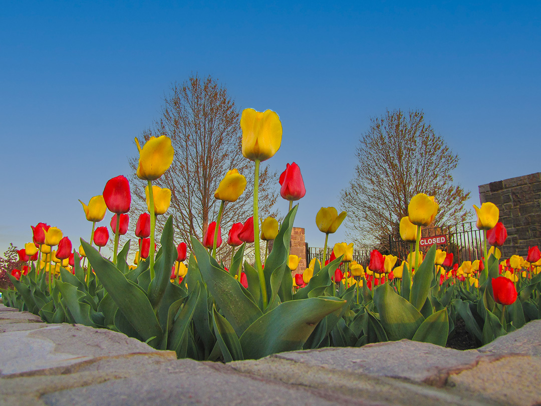 I think the colors are perfect. The angle adds a great deal of interest. If taken from the usual vantage point this would just be another nice flower picture. The diagonals of the composition suggest a diamond shape (the apex of the flowers on top, the corner of the wall on bottom.) I tried PS sky replacement using a nice deep blue sky. But that sky had to ne masked off of the subject, and that was very tedious. I think your sky is good. Removing the closed sign is a little too intimidating to me. |