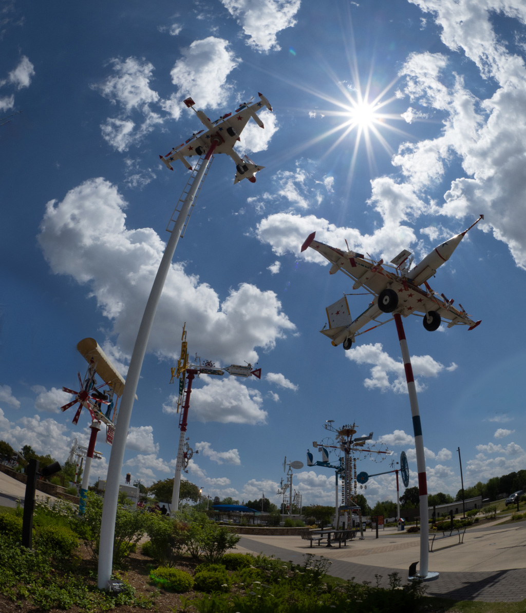 I try to comment before looking at the other comments, so please forgive any repetition. Love the sky, the sunburst, the curved poles. I thought they were real planes at first. The vertical composition makes the planes look like they are high in the sky (and tethered, too. Hmmm.) The only thing I would suggest is to somehow clone out those partial planes on the right and left edges. I didn't do a very good job. I also used Viveza to brighten up the lower left corner. But some might rightly criticize that as distracting from the subject. |