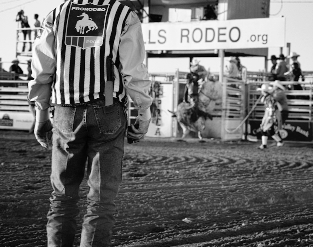Welcome, Nancy. Glad to have you aboard. My goodness, you are brave! Were you in the ring with the action? Black and white is the right choice for this image. Bright colors in the background would have distracted from the subject. I would suggest cropping from the left just to eliminate that sign on the fence. That puts the judge in a nice rule-of-thirds position. I also lightened the midtones a smidge - but that's personal preference. |