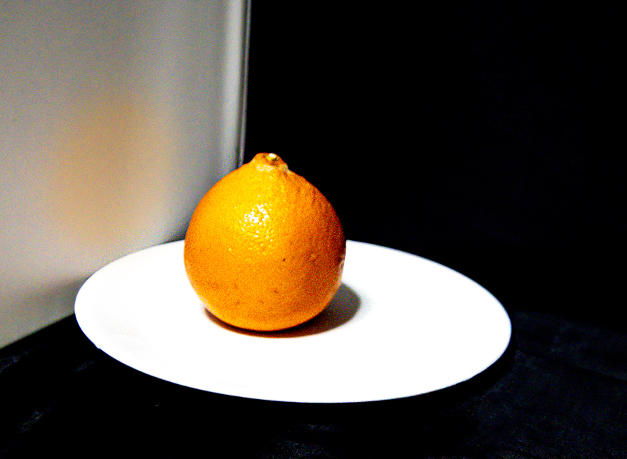 The orange really stands out well in your final version. But the overall image seems too bright for my taste. I rather like the bold graphics of the original. I cropped from the right, then added a suggestion of an orange reflection to the light area on the left. |