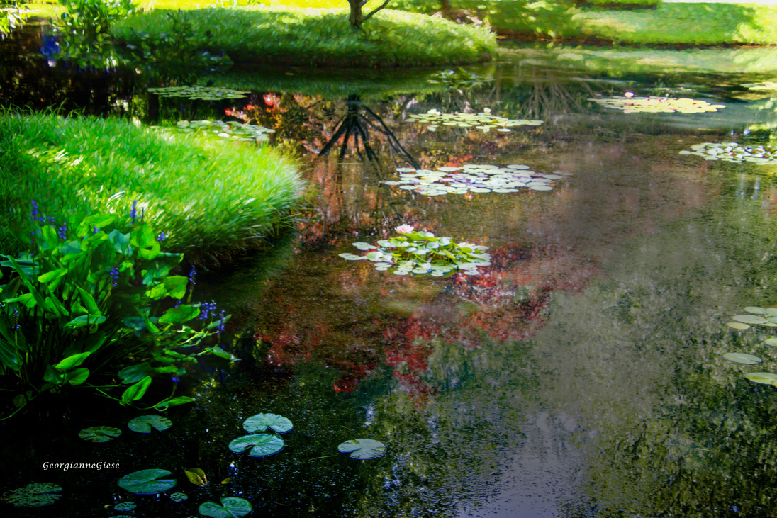 This imager is certainly reminiscent of Monet. But I find that the reflections are very busy making it hard to distinguish the lily pads that seem to my eye to be the subject. I used the burn tool to darken just the watery areas. It is a pretty scene, one just begging to be photographed. |