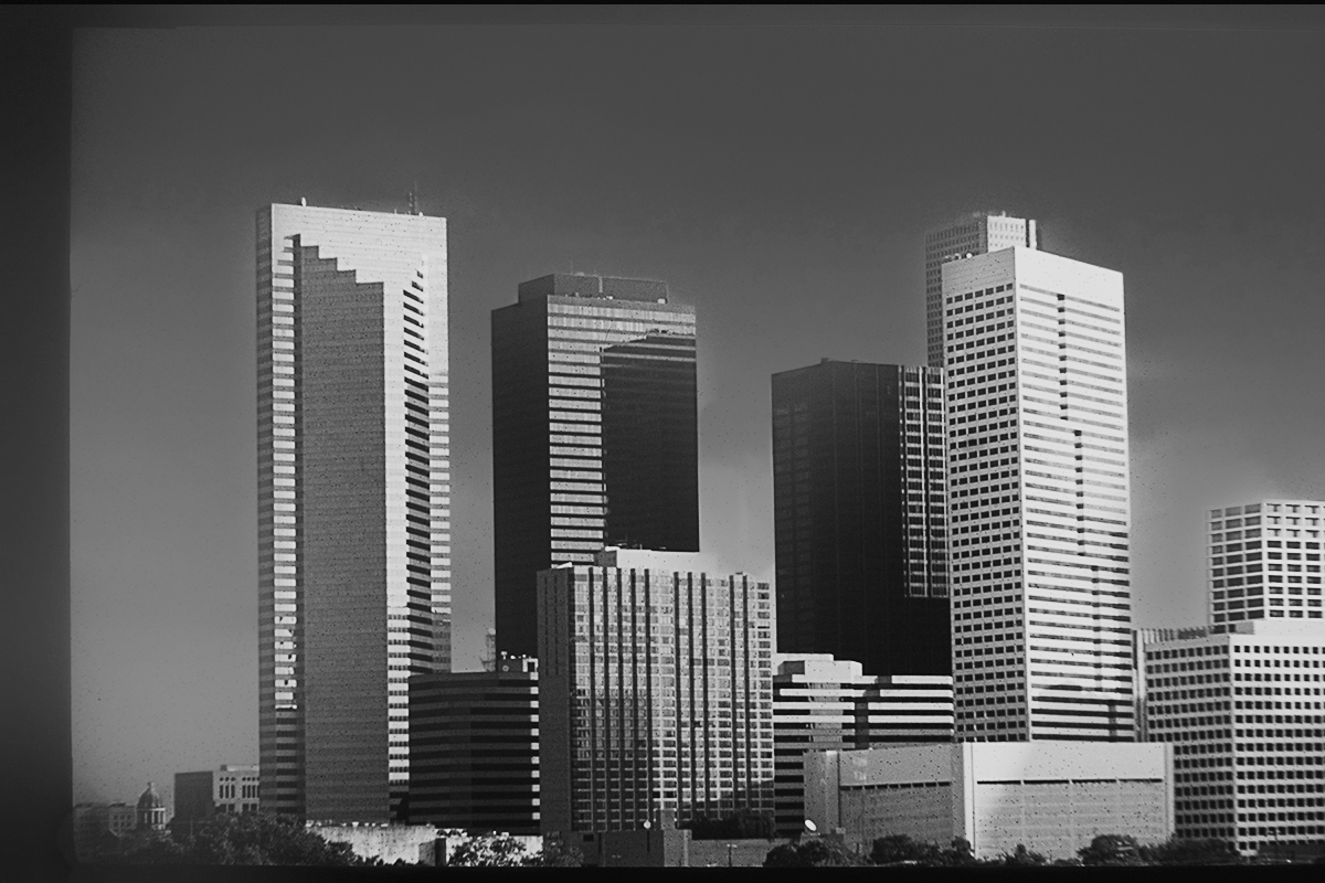 I'm sure there were lots of sections of this skyline to choose from. This one is quite attractive. There is enough overlapping of the buildings and good sidelight to add depth to the shot. The new sky seems a bit bright, but it does match the lighting on the buildings. Actually< I like the original sky because it provides a dark background to the light buildings. I played with this in Silver Effects. The original sky had a lot of dirt spots, so it ultimately had to be replaced. |