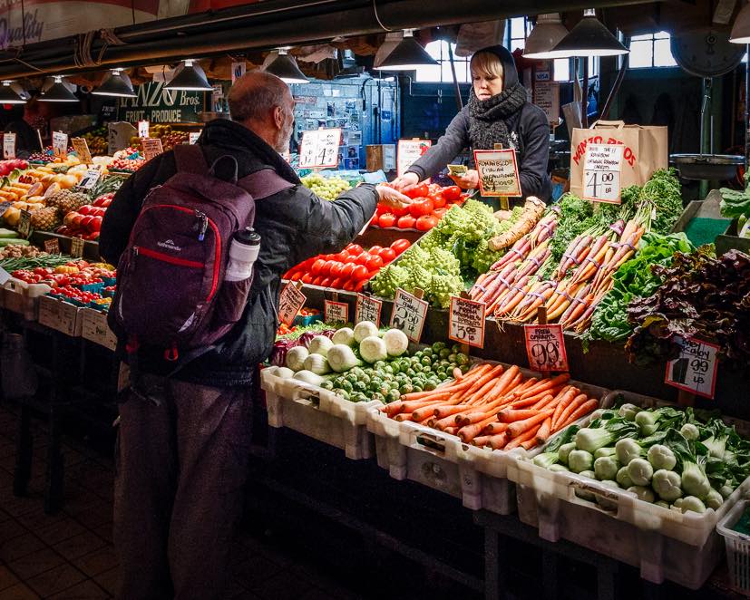 Great subject matter and color. I like to get pictures of produce displays whenever I can. The stars of the image are the 2 people making the transaction. I thought that by removing the 2 onlookers with a crop places the remaining 2 people at the focal points of the rule of thirds. I added a slight amount of vignetting and brightened the center to try to add more attention to the subjects. |